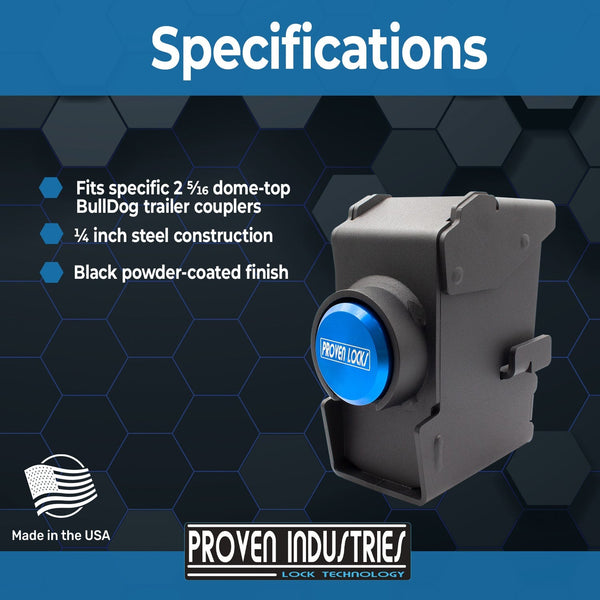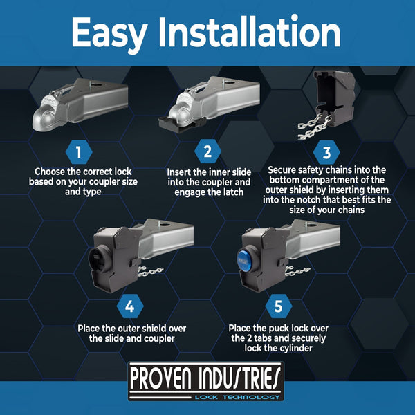 Designing the best coupler locks is not an easy task. We pride ourselves on producing a glove like" fit coupler lock. Rest assured that Proven Industries trailer lock products will leave you with simply the best coupler lock on the market. This model will secure most size safety chains.